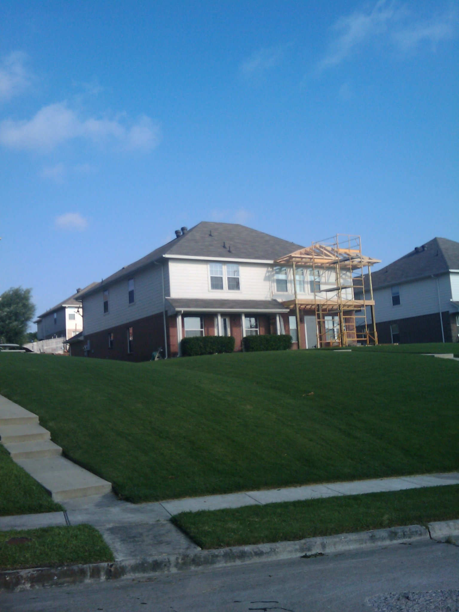 Everything is almost framed up and ready for the composition roof. This adds class to the front of the lake front house. We will also be adding a wrought iron hand rail around the balcony.